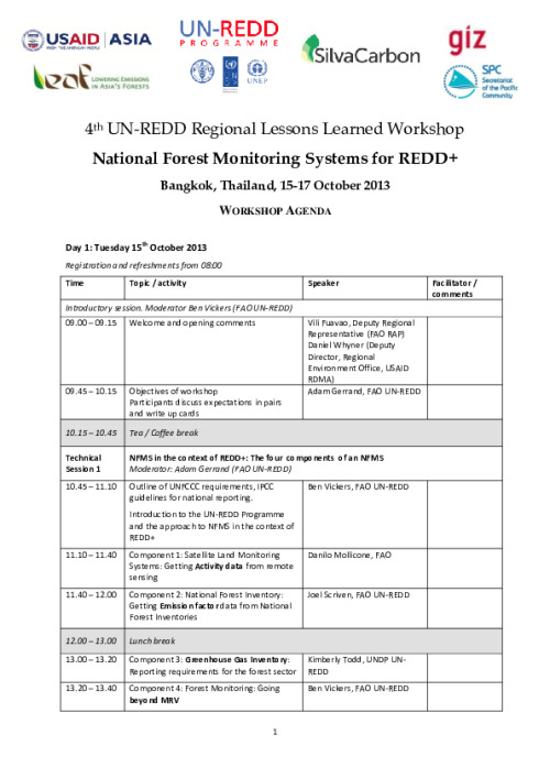 AGENDA for 4th UN-REDD Regional Lessons Learned Workshop National Forest Monitoring Systems for REDD+