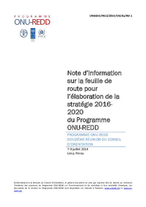 Home Document Library UNREDD_PB 12_2014_VIII_8a_Info Note On Roadmap For Programme Strategy 2016-2020_FR UNREDD_PB 12_2014_VIII_8a_Info Note on Roadmap for Programme Strategy 2016-2020_FR Mon, 23 Jun, 2014 Download the resource Format: application/pdf Size: (0.223 MB) download Filed under: Category Empty Related publications View all Foundation documents 23 May, 2025UN-REDD Programme Developer 23/05/2025 - Document Download English 21 May, 2025UN-REDD Programme Draft UN-REDD 2026-2030 Strategy Download English 21 May, 2025UN-REDD Programme Draft Monitoring and Evaluation Framework UN-REDD 2026-30 Download English