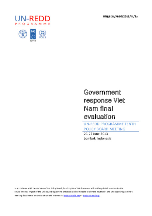 Home Document Library UNREDD_PB10_Government_response_Viet_Nam_NP_final_evaluation_EN UNREDD_PB10_Government_response_Viet_Nam_NP_final_evaluation_EN Thu, 06 Jun, 2013 Download the resource Format: application/pdf Size: (0.258 MB) download Filed under: Tags Viet Nam final evaluation Category Empty Related publications View all Foundation documents 23 May, 2025UN-REDD Programme Developer 23/05/2025 - Document Download English 21 May, 2025UN-REDD Programme Draft UN-REDD 2026-2030 Strategy Download English 21 May, 2025UN-REDD Programme Draft Monitoring and Evaluation Framework UN-REDD 2026-30 Download English