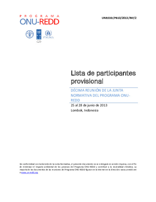 Home Document Library UNREDD_PB10_Lista de Participantes Provisional - ES UNREDD_PB10_Lista de participantes provisional - ES Fri, 21 Jun, 2013 Download the resource Format: application/pdf Size: (0.384 MB) download Filed under: Category Empty Related publications View all Foundation documents 23 May, 2025UN-REDD Programme Developer 23/05/2025 - Document Download English 21 May, 2025UN-REDD Programme Draft UN-REDD 2026-2030 Strategy Download English 21 May, 2025UN-REDD Programme Draft Monitoring and Evaluation Framework UN-REDD 2026-30 Download English