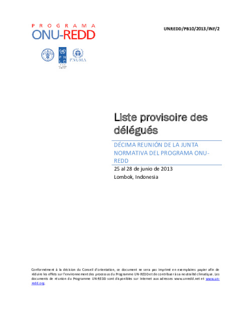 Home Document Library UNREDD_PB10_Liste Provisoire Des Délégués - FR UNREDD_PB10_Liste provisoire des délégués - FR Fri, 21 Jun, 2013 Download the resource Format: application/pdf Size: (0.416 MB) download Filed under: Category Empty Related publications View all Foundation documents 23 May, 2025UN-REDD Programme Developer 23/05/2025 - Document Download English 21 May, 2025UN-REDD Programme Draft UN-REDD 2026-2030 Strategy Download English 21 May, 2025UN-REDD Programme Draft Monitoring and Evaluation Framework UN-REDD 2026-30 Download English