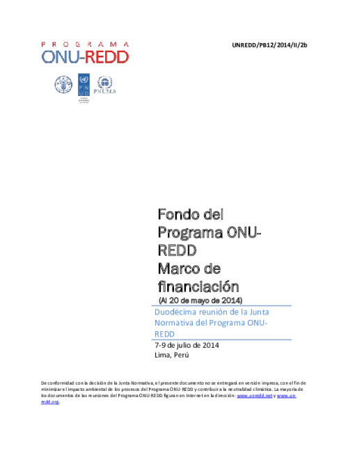 Home Document Library UNREDD_PB12_2014_II_2b_Funding Framework (SPN) UNREDD_PB12_2014_II_2b_Funding Framework (SPN) Mon, 09 Jun, 2014 Download the resource Format: application/pdf Size: (0.358 MB) download Filed under: Category Empty Related publications View all Foundation documents 23 May, 2025UN-REDD Programme Developer 23/05/2025 - Document Download English 21 May, 2025UN-REDD Programme Draft UN-REDD 2026-2030 Strategy Download English 21 May, 2025UN-REDD Programme Draft Monitoring and Evaluation Framework UN-REDD 2026-30 Download English
