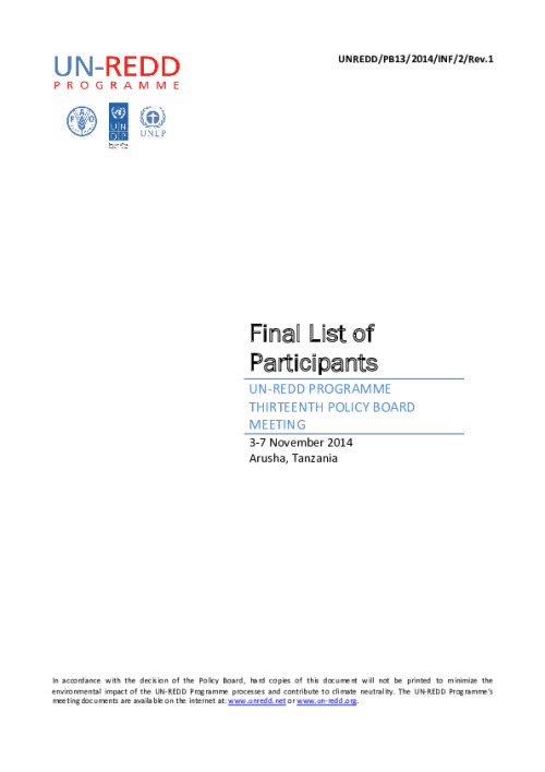 Home Document Library UNREDD_PB13_2014_INF_2_Rev.1_Final List of Participants UNREDD_PB13_2014_INF_2_Rev.1_Final List of Participants Fri, 14 Nov, 2014 Download the resource Format: application/pdf Size: (0.265 MB) download Filed under: Tags PB13 list of participants Category Empty Related publications View all Foundation documents 23 May, 2025UN-REDD Programme Developer 23/05/2025 - Document Download English 21 May, 2025UN-REDD Programme Draft UN-REDD 2026-2030 Strategy Download English 21 May, 2025UN-REDD Programme Draft Monitoring and Evaluation Framework UN-REDD 2026-30 Download English