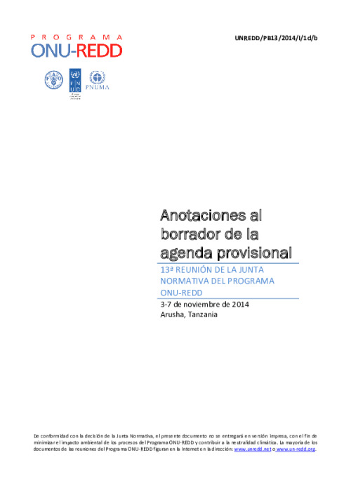 Home Document Library UNREDD_PB13_2014_Provisional Annotated Agenda_Rev1_ES UNREDD_PB13_2014_Provisional Annotated Agenda_Rev1_ES Thu, 23 Oct, 2014 Download the resource Format: application/pdf Size: (0.429 MB) download Filed under: Category Empty Related publications View all Foundation documents 23 May, 2025UN-REDD Programme Developer 23/05/2025 - Document Download English 21 May, 2025UN-REDD Programme Draft UN-REDD 2026-2030 Strategy Download English 21 May, 2025UN-REDD Programme Draft Monitoring and Evaluation Framework UN-REDD 2026-30 Download English