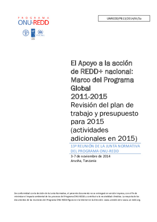 Home Document Library UNREDD_PB13_2014_SNA_Work Plan and Budget Rev 2015_additional Activities_ESP UNREDD_PB13_2014_SNA_Work Plan and Budget Rev 2015_additional activities_ESP Wed, 15 Oct, 2014 Download the resource Format: application/pdf Size: (0.891 MB) download Filed under: Category Empty Related publications View all Foundation documents 23 May, 2025UN-REDD Programme Developer 23/05/2025 - Document Download English 21 May, 2025UN-REDD Programme Draft UN-REDD 2026-2030 Strategy Download English 21 May, 2025UN-REDD Programme Draft Monitoring and Evaluation Framework UN-REDD 2026-30 Download English