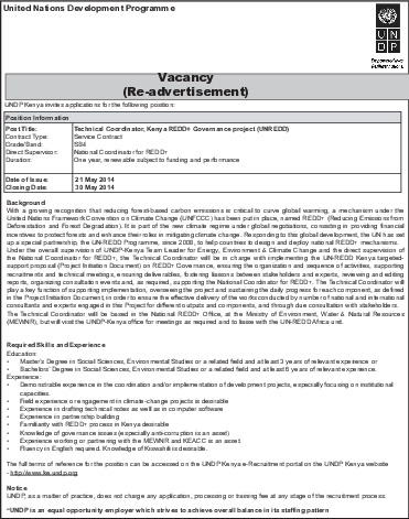 Vacancy - Technical Coordinator- UN-REDD Governance Targeted support in Kenya