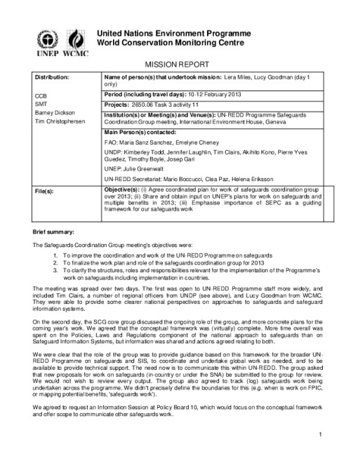 Home Document Library WCMC SCG Geneva Meeting Feb 2013 WCMC SCG Geneva meeting Feb 2013 Tue, 21 May, 2013 Download the resource Format: application/pdf Size: (0.438 MB) download Filed under: Category Safeguards and Multiple Benefits mission reports Related publications View all Foundation documents 23 May, 2025UN-REDD Programme Developer 23/05/2025 - Document Download English 21 May, 2025UN-REDD Programme Draft UN-REDD 2026-2030 Strategy Download English 21 May, 2025UN-REDD Programme Draft Monitoring and Evaluation Framework UN-REDD 2026-30 Download English