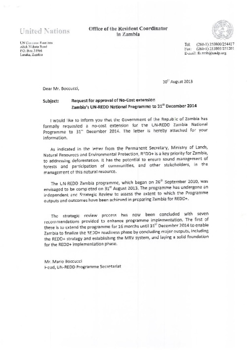 Full documentation submitted by the National Programme in Zambia, justifying and requesting a no-cost extension of the programme and providing a management response and adjusted action plan.