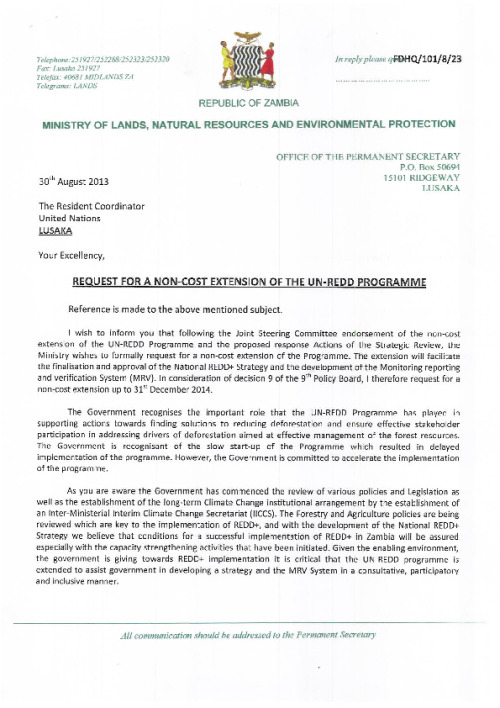 Full documentation submitted by the National Programme in Zambia, justifying and requesting a no-cost extension of the programme and providing a management response and adjusted action plan.